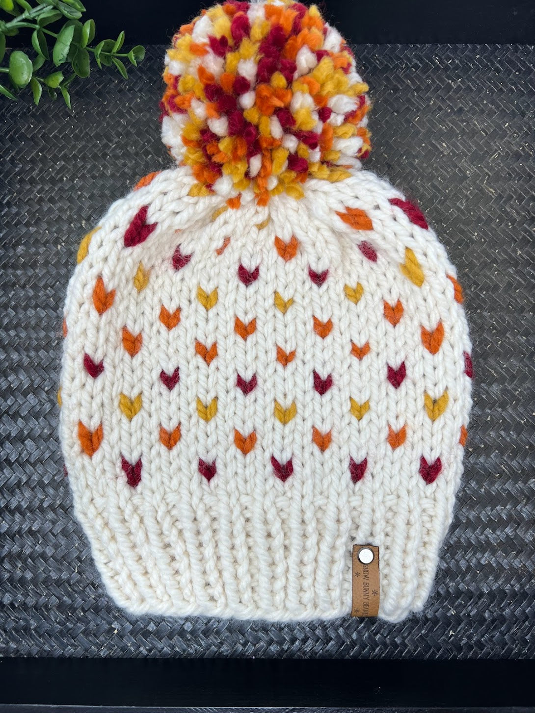 COLORS → Ivory wool with Acrylic yarn with orange, Butterscotch and cranberry hearts.