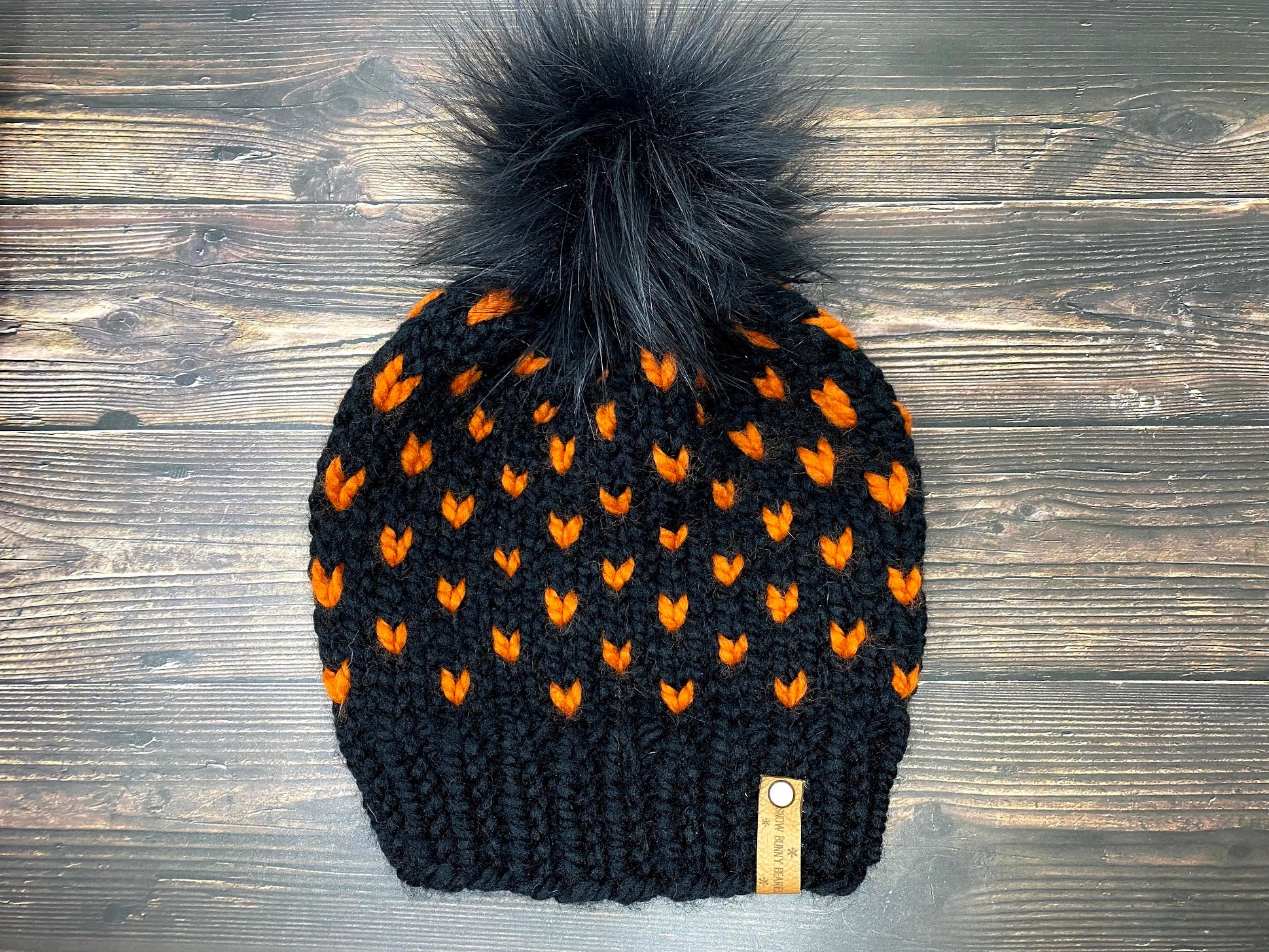 Stay warm and stylish this Fall and Halloween season with our comfy and cute hand knitted beanie. Made from chunky black yarn and adorned with orange hearts, our beanie offers you a choice of pom to complete your look - either a stylish yarn pom or a handmade faux fur pom. Perfect for all Halloween fans!
