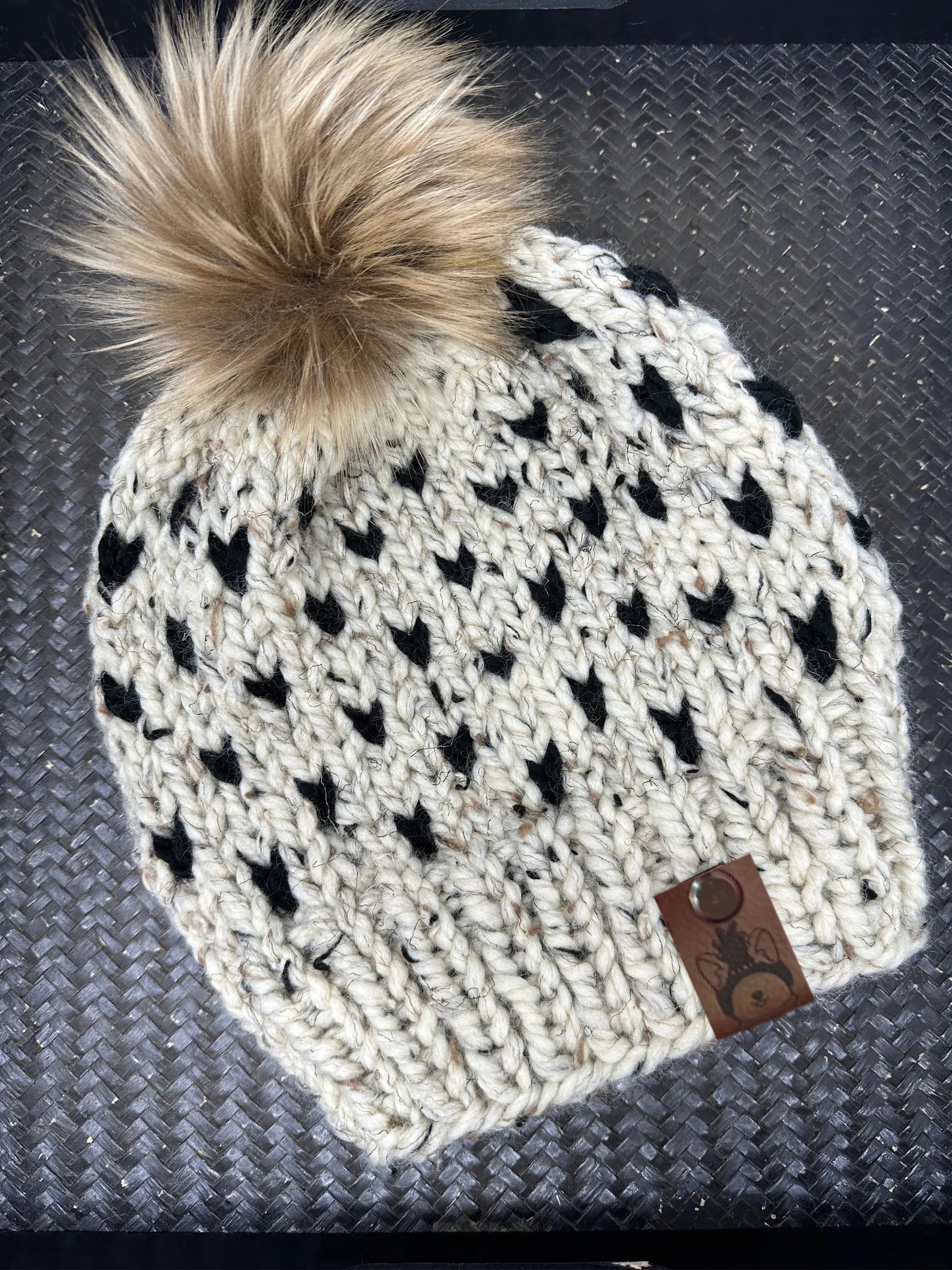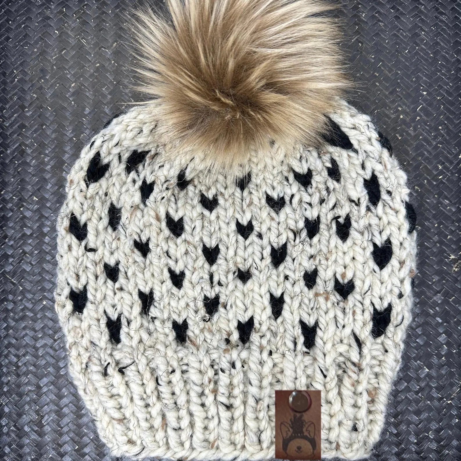 Add a fun and cute touch to your winter wardrobe with our cozy beanies! Made from soft and warm yarn, these beanies are perfect for staying toasty on chilly days. Each one features a handmade faux fur pom for a touch of luxury. Personalize your beanie with your favorite main color and a contrasting shade for the little hearts. Create a unique beanie that reflects your personality and style.