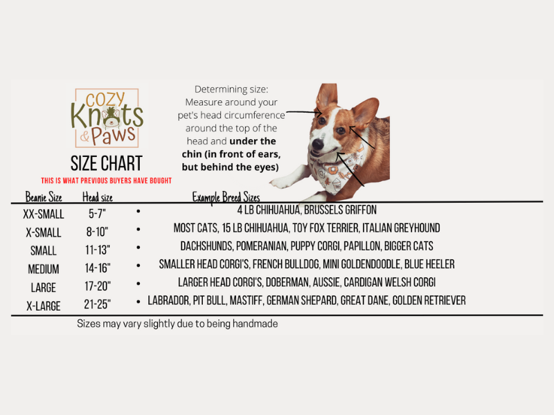 Determining size: Measure around your pet’s head circumference around the top of the head and under the chin (in front of ears, but behind the eyes) and select the size below. :) Every Dog head is different, the measurements are below from what I use.