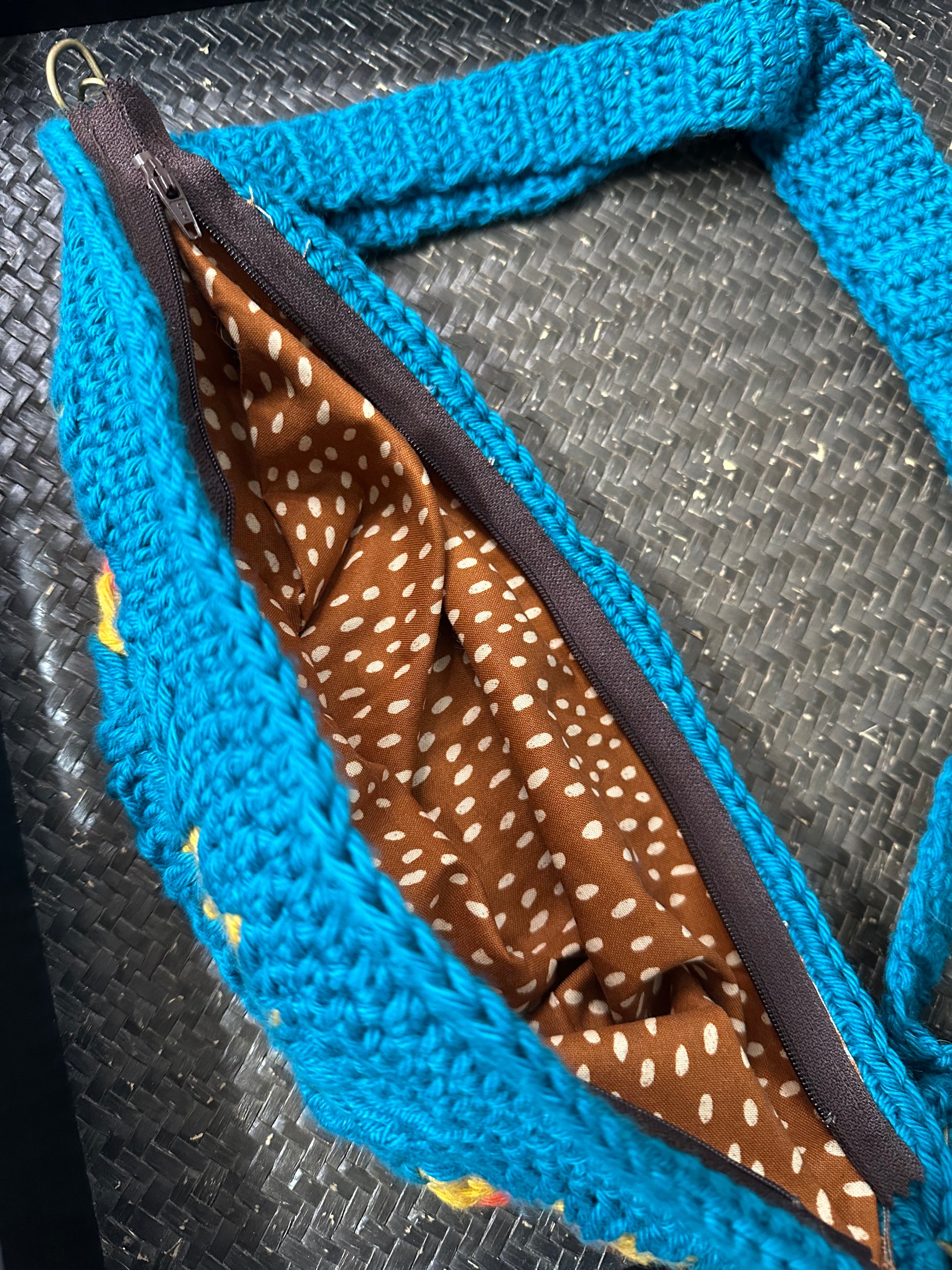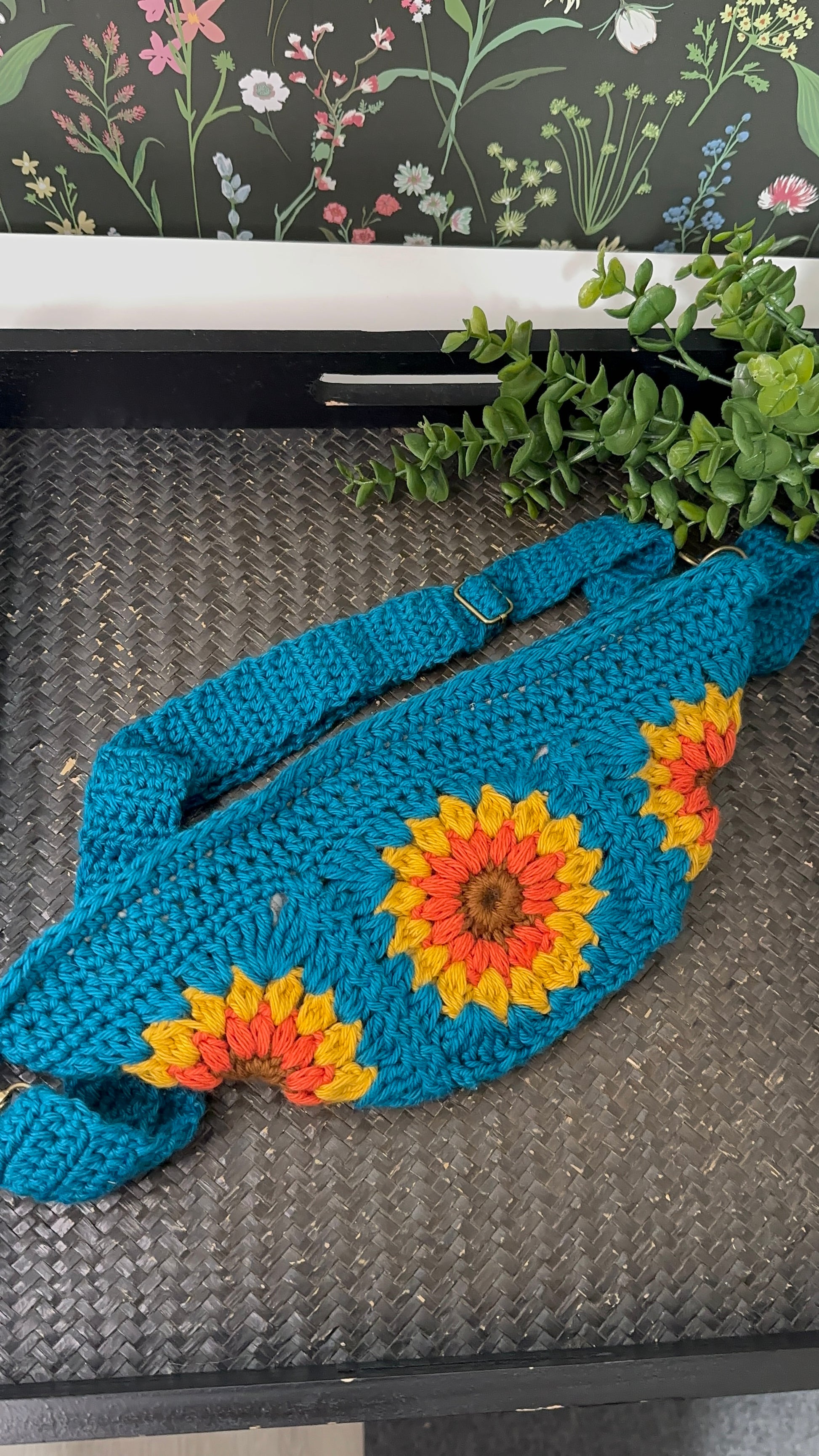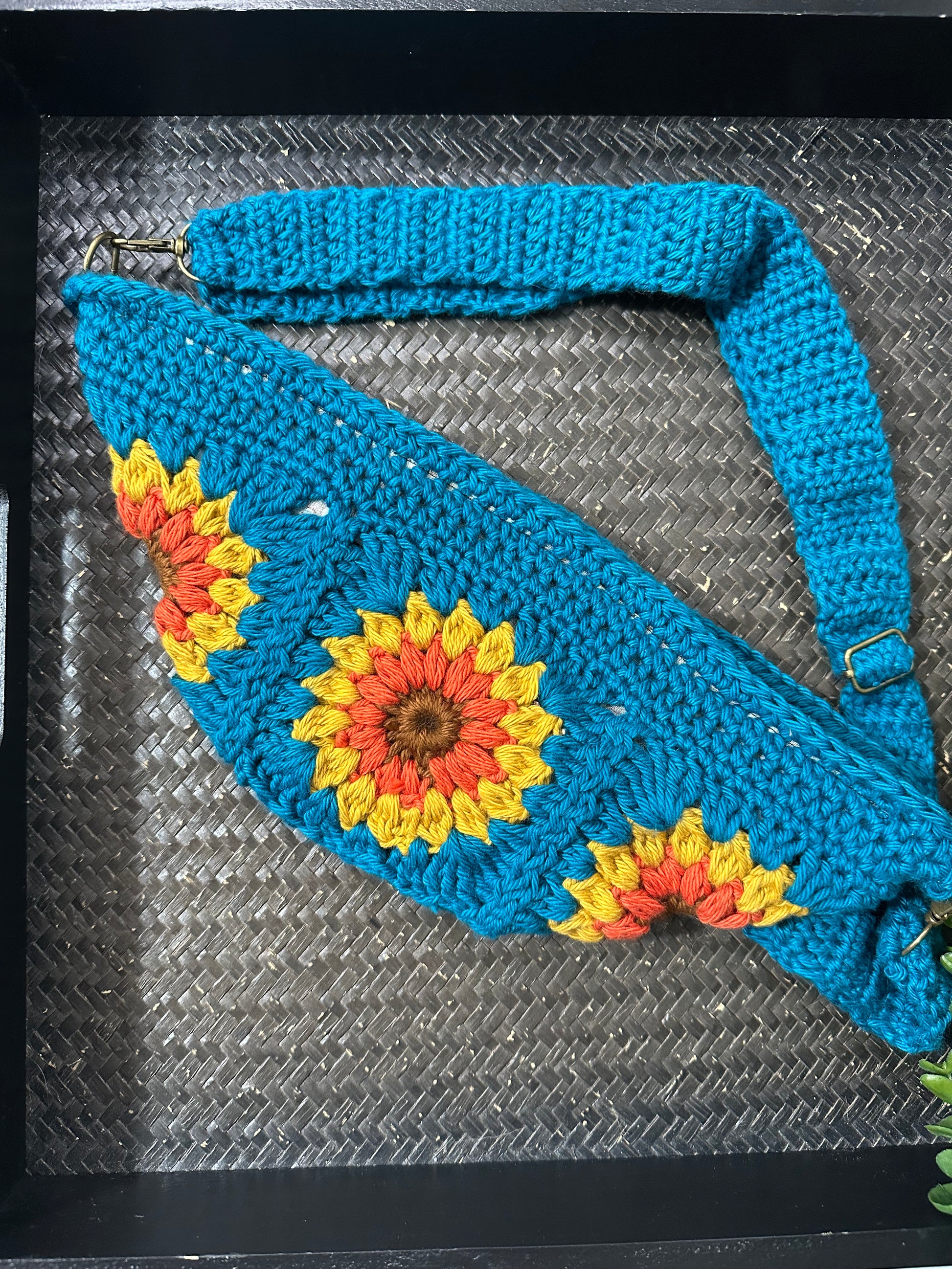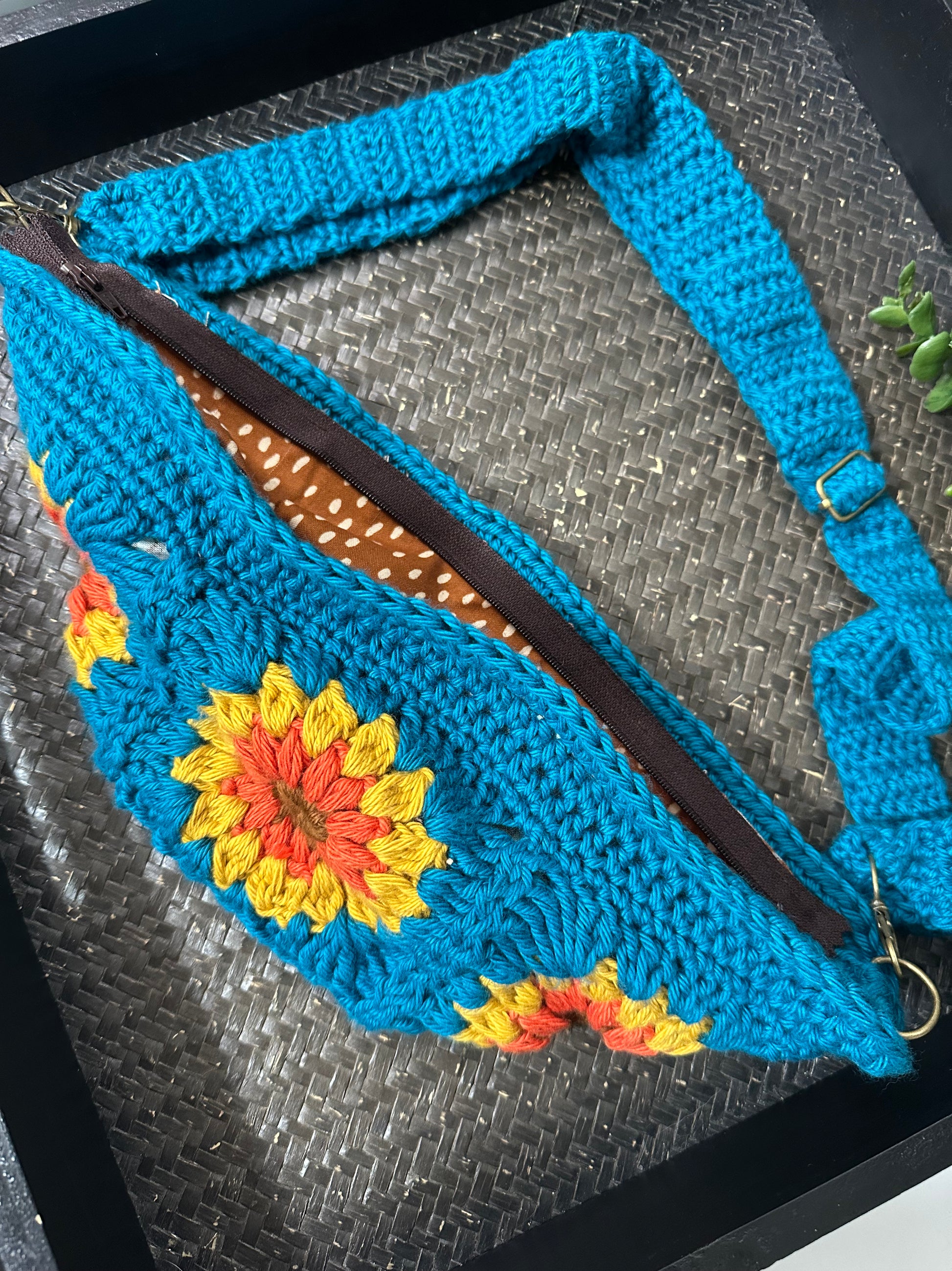 The Sunburst Crossbody Bag is a vibrant, customizable accessory made from soft cotton yarn. The adjustable strap and zipper-lined interior add practicality to its fun and cute design. Choose your own colors and fabric to make it truly unique.
