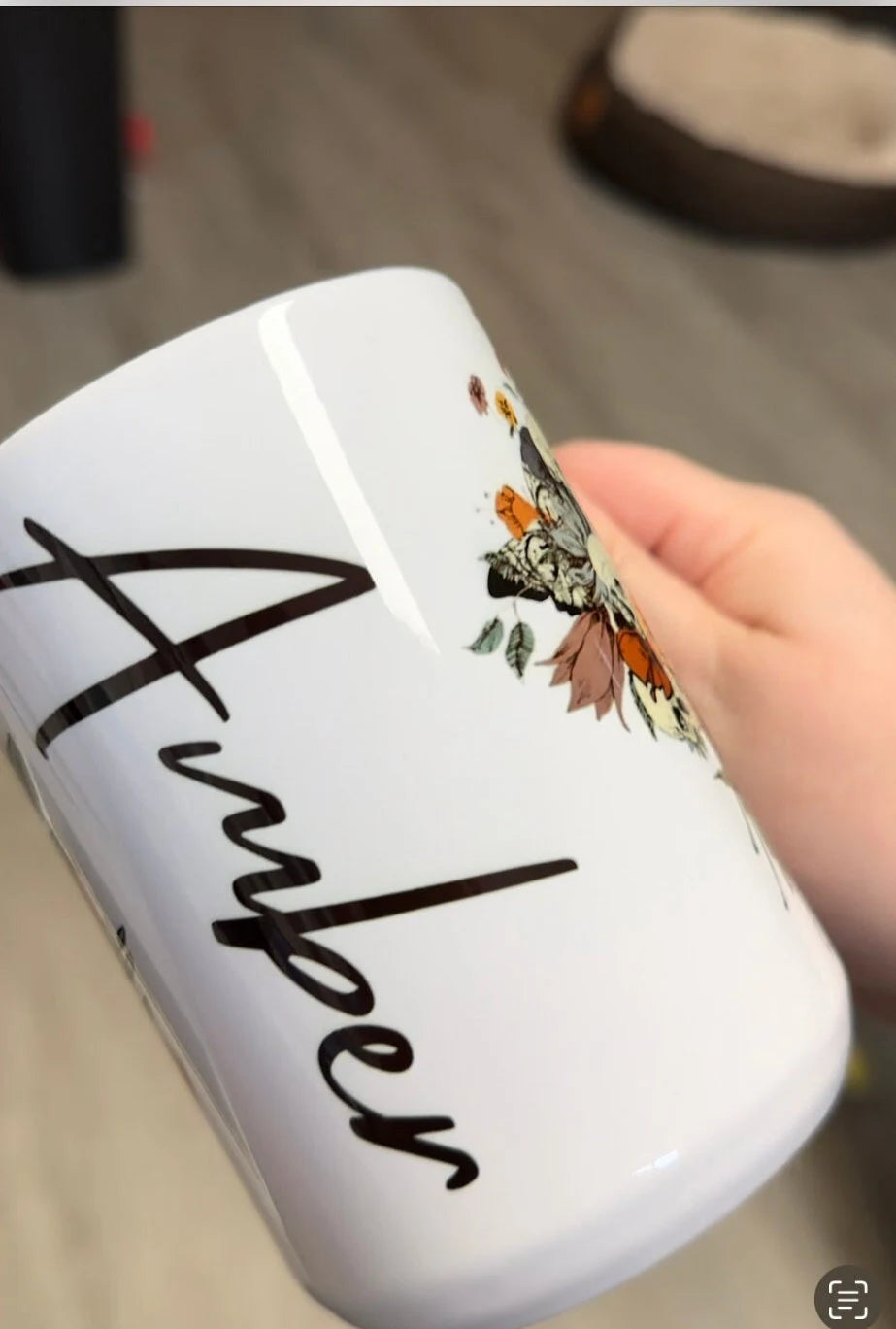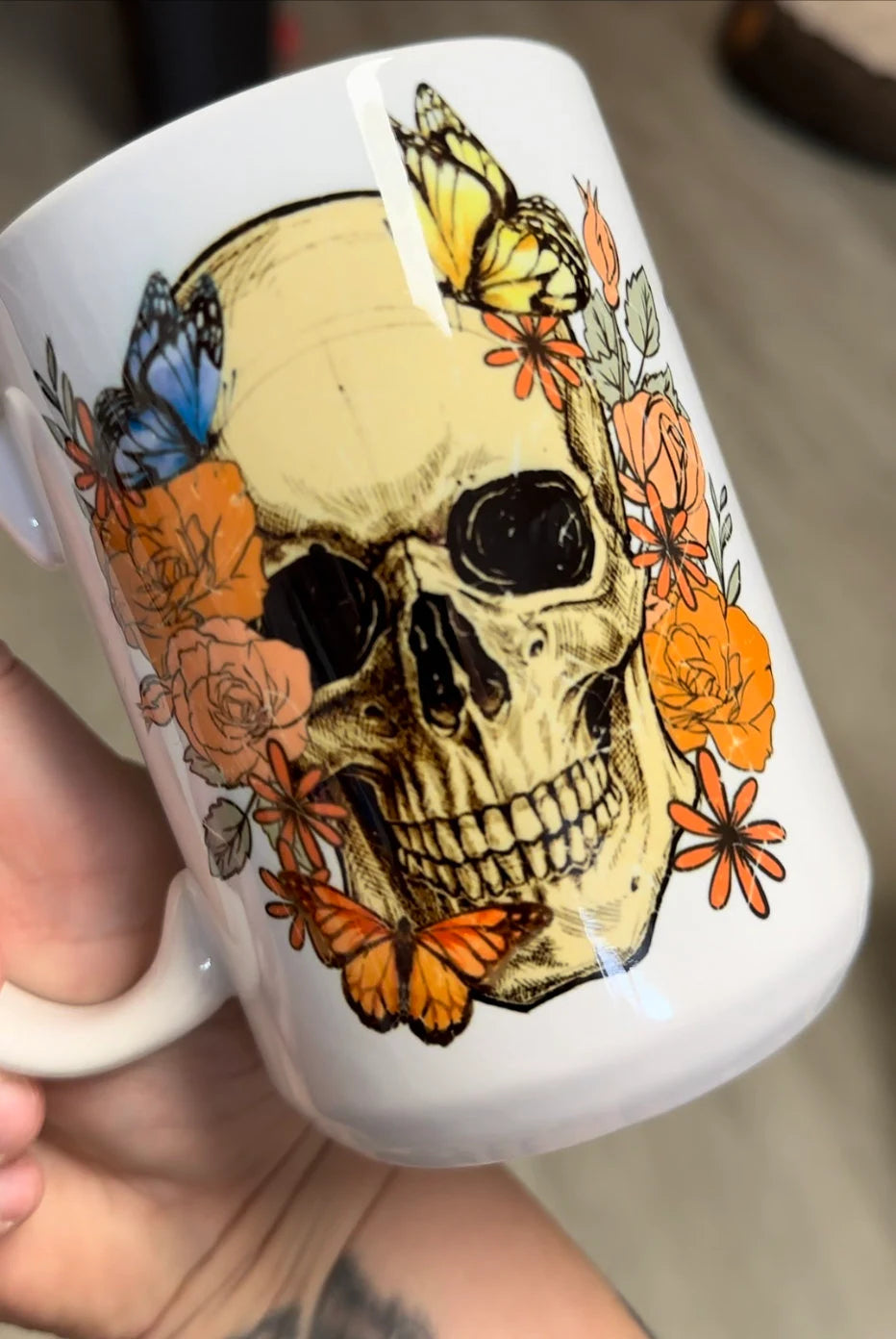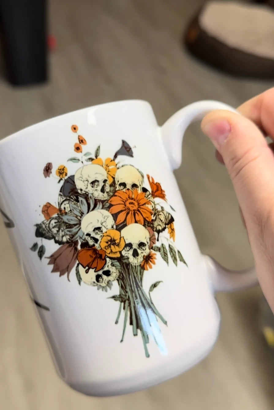 This 15 oz personalized coffee mug features a beautiful bouquet of delicate flowers and skulls in a unique and captivating design. Personalize the mug further by adding your own name for the perfect touch. Combining edgy and classic elements, this mug is sure to be a hit.