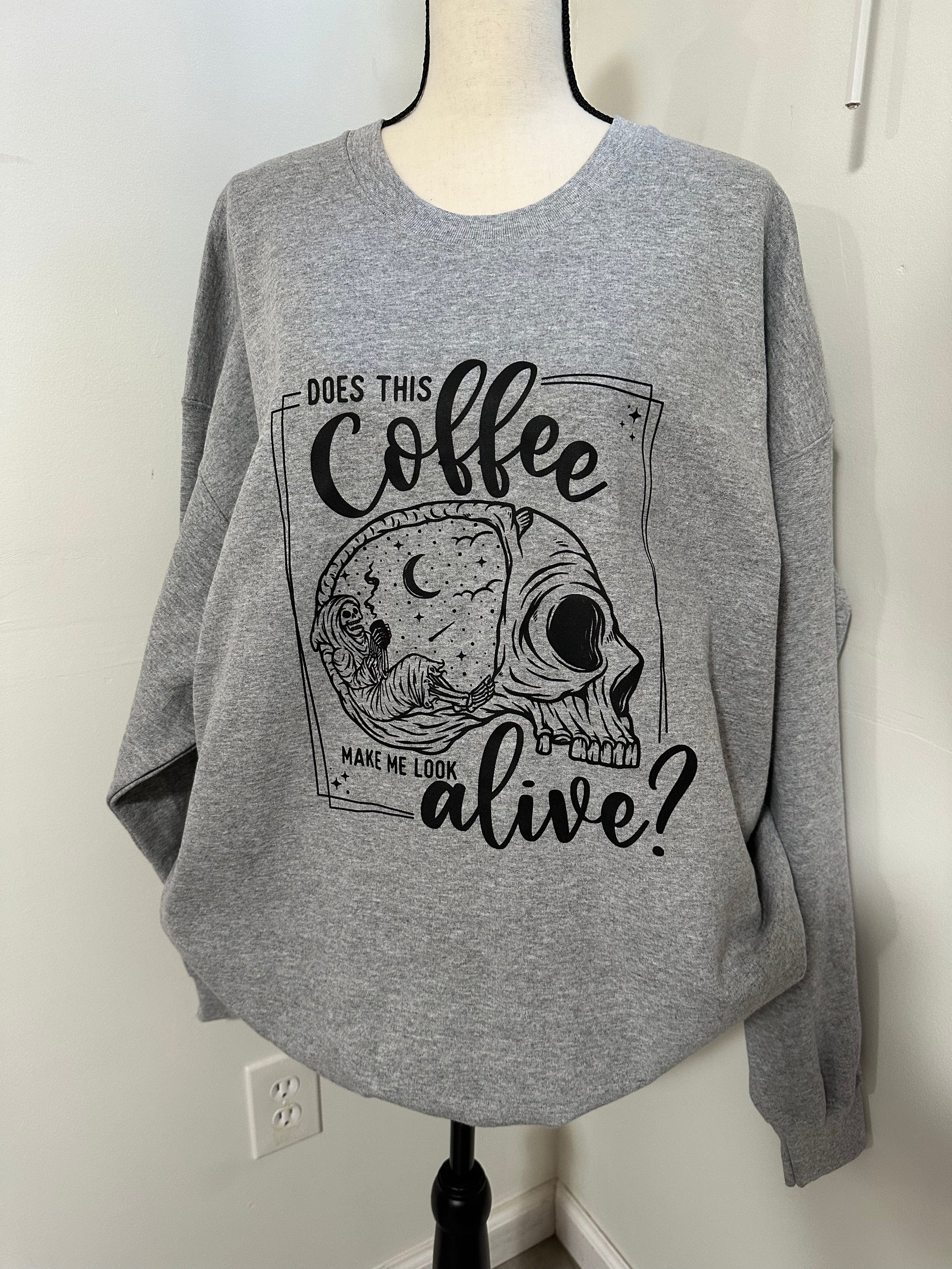 2 X-Large Does this coffee make me look alive crewneck sweater. Grey Sweater